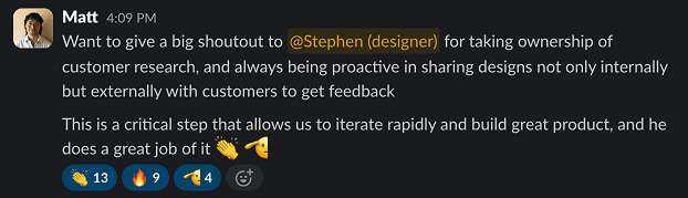 One thing that especially stood out to me is Stephen's ability to proactively research and convert customer insights into impactful product initiatives. He pairs great design taste with strong communication, especially when storytelling and articulating customer problems and use cases.