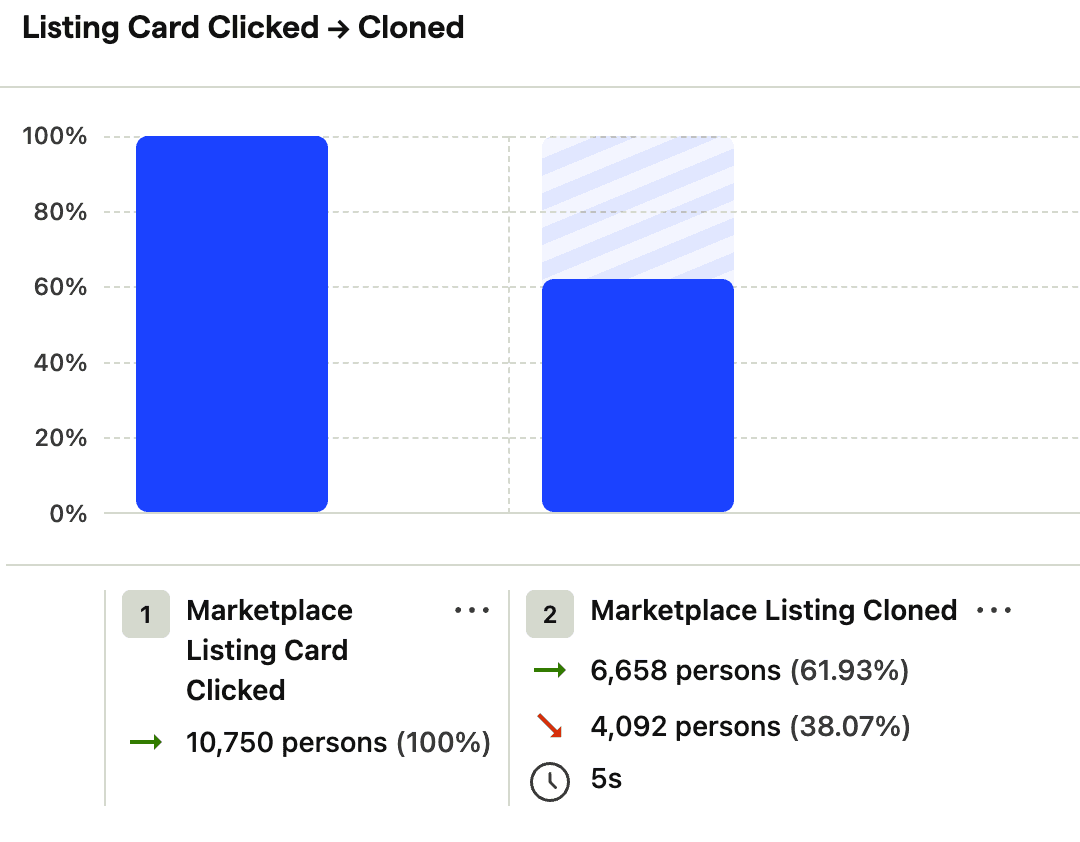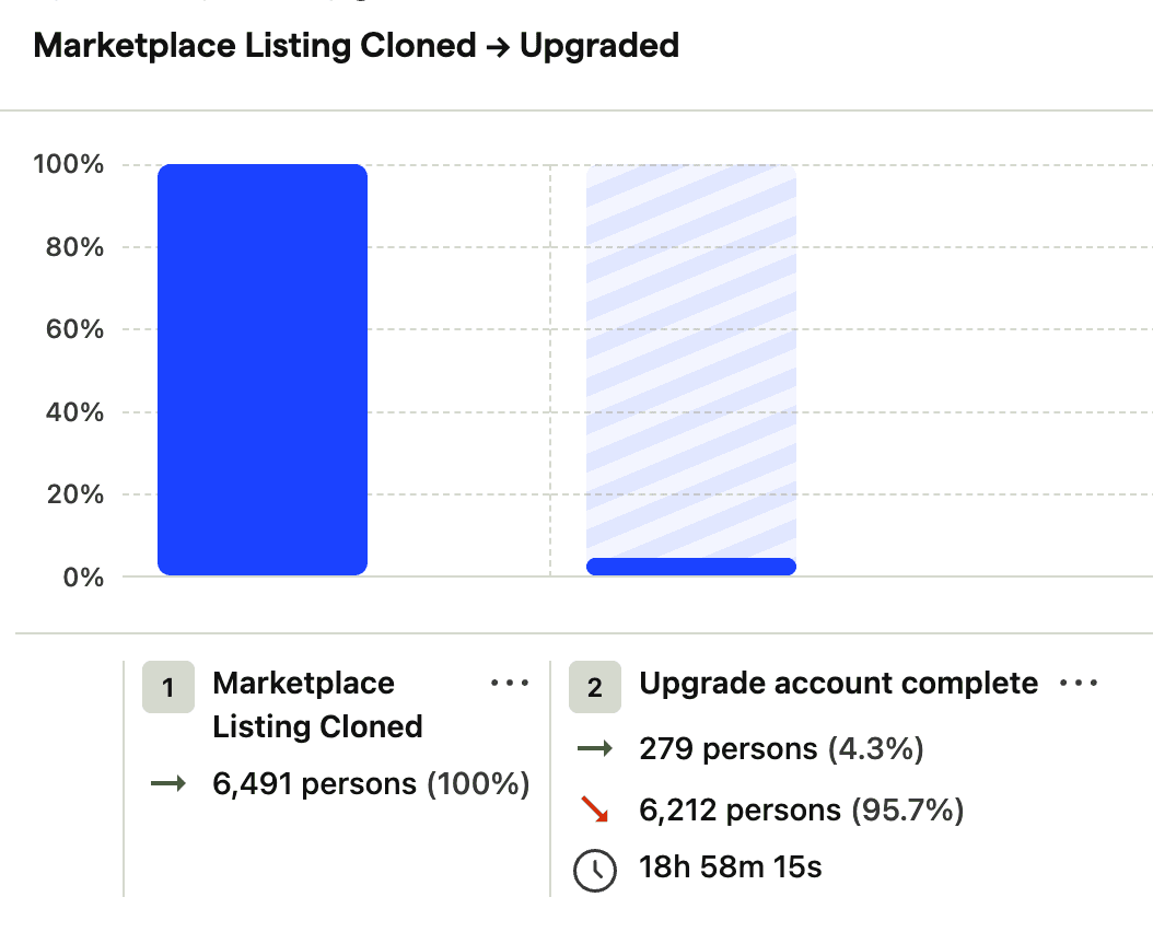 4.3% of users who clone a marketplace listing upgrade to a paid plan. The total average of all sign ups is around 1.9%.