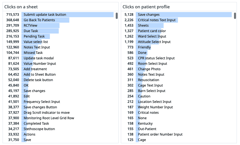 Utilizing Datadog, quantitative data helped fully validate exactly what were the most common actions being performed on the patient sheet. I also learned that 50% of treatment sheet sessions are spent with 5 seconds or less and 30% of whiteboard sessions are spent with 5 seconds or less. The way I interpret this is users are spending “low-quality sessions,” resulting in a very jarring navigational experience.